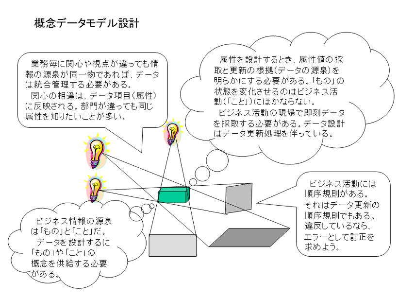 ビジネス組織が関心を持つ実世界の事実を捉え、蓄積し、働く人々が共同利用できるよう情報システムを構築する必要があります。情報システム構築の第一歩としてビジネスの関心対象である「もの」および、ビジネス活動(「こと」)の事実を表現し、それらの間の関係を検索できるデータを設計することが肝要です。そのようにして設計されたデータを見れば、人々の事実認識がしかるべき水準まで揃い、力を合わせて問題解決に取り組めるでしょう。